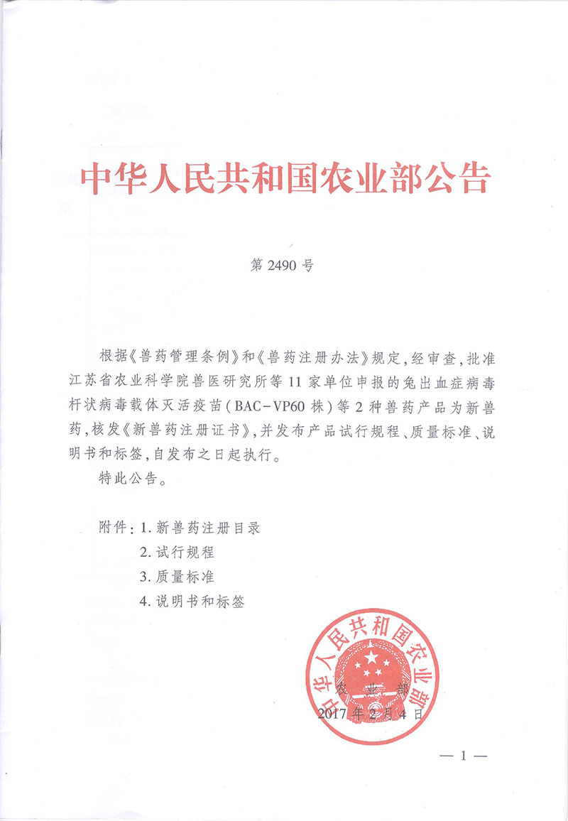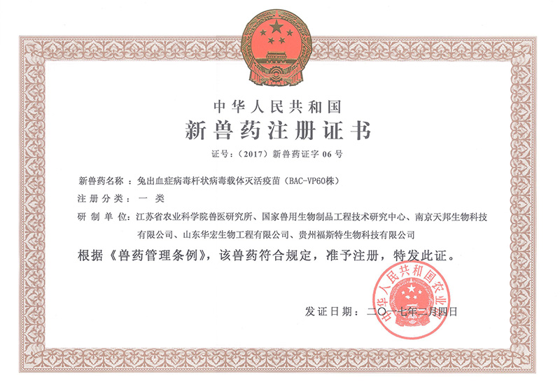 華宏生物聯(lián)合江蘇省農(nóng)科院共同申報(bào)的兔出血癥病毒桿狀病毒載體滅活疫苗(BAC-VP60株)獲得的新獸藥證書。