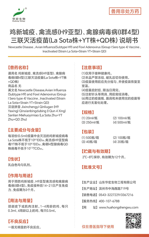 雞新城疫、禽流感(H9亞型)、禽腺病毒(Ⅰ群4型)三聯(lián)滅活疫苗(La sota株+YT株+QD株)