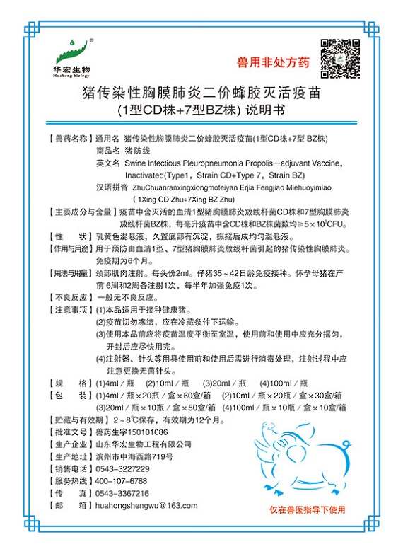 豬傳染性胸膜肺炎二價蜂膠滅活疫苗(1型CD株+7型BZ株)
